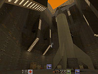 the transition from there to "Transportation Central" is smooth and logical, as is the introductory F1. the architecture in this level is, for whatever reason, very plain, and the level itself is very short, but don't let that fool you -- this level sports some of the best running combat situations i've yet played. the monster strength rises sharply here, but since the monsters drop the relevant hardware (you get both the rocket launcher and the railgun in the first bright room), you'll be more than adequately armed... after you kill them, of course. the flow here is linear (there are really only three rooms, with one connecting corridor, after all) and the pacing, as noted, is brutal and a whole lot of fun. the bridge mechanism (that lowers the bridge in the bottom shot) is very cool. the end of this level is a bit abrupt (i expected the door to open, not the level to change). nitpick: if you shoot the tank commander from across the pit, and he's too close to the edge when he dies, the red key drops into the lava, making further progress impossible.